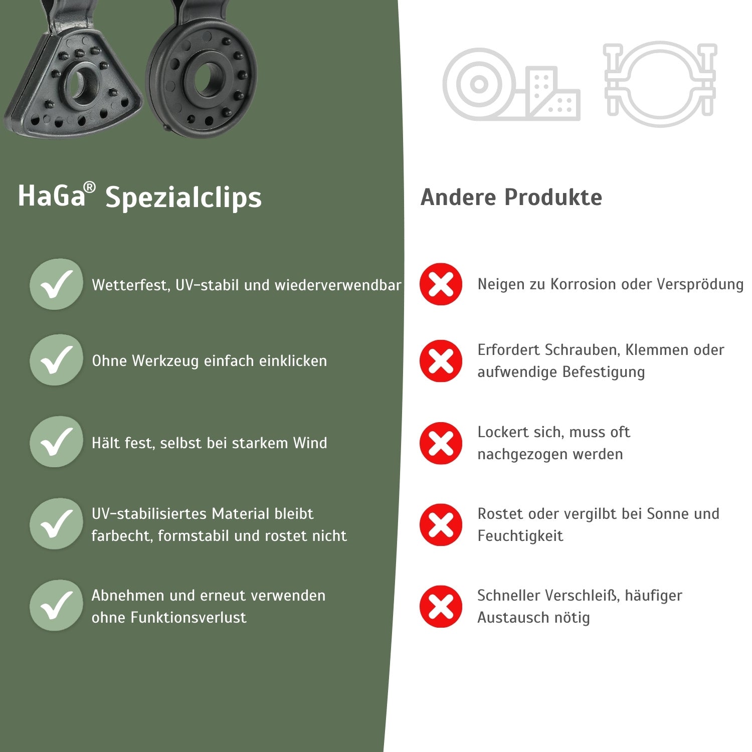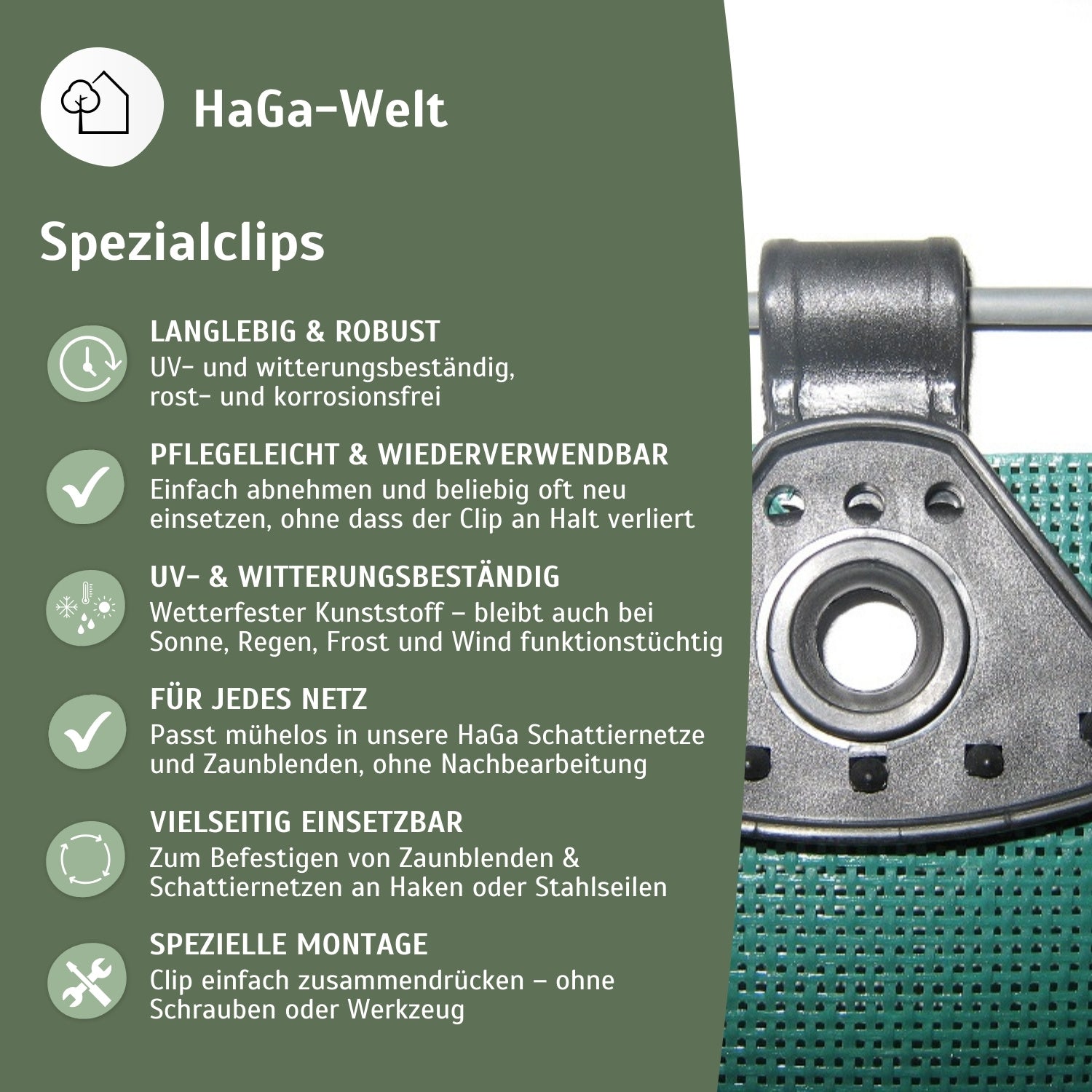 Mit diesem Spezialclip können Sie Ihre Schattiernetze, Windschutznetze und Sichtschutznetze einfach, bequem und schnell aufhängen und befestigen. Der runde Spezialclip schafft dabei eine Öse im Netz und kann so an entsprechenden Haken aufgehängt werden. Darüber hinaus besteht die Möglichkeit den Clip an einem Stahlseil aufzuhängen. Der verwendete Kunststoff ist wetter- und witterungsbeständig und sehr stabil. Der Clip wird einfach an der passenden Stelle auf dem Netz zusammengedrückt. Die Clips werden im Abstand von ca. 30-40 cm gesetzt.