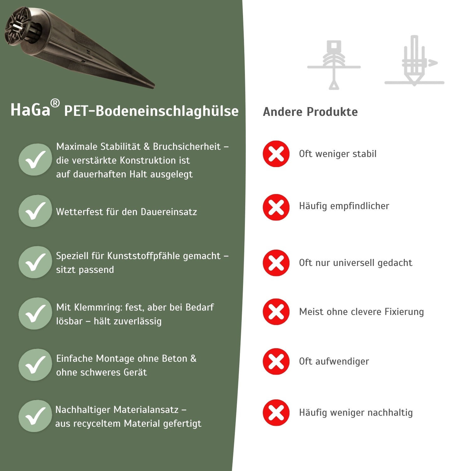 Wenn Sie also eine Bodenhülse suchen, die langlebig, einfach zu montieren und nachhaltig ist, dann entscheiden Sie sich für unsere Einschlaghülse mit Glasfaserverstärkung. Sie ist die ideale Grundlage für Ihr nächstes Gartenprojekt.