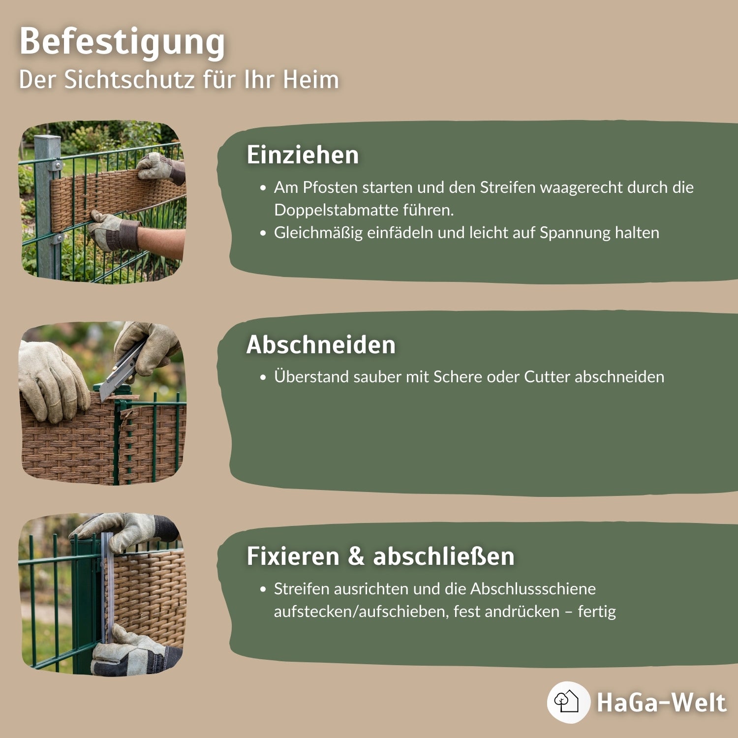 • Einfache Montage: Die Sichtschutzstreifen können einfach eingefädelt und mit den Abschlussleisten befestigt werden.