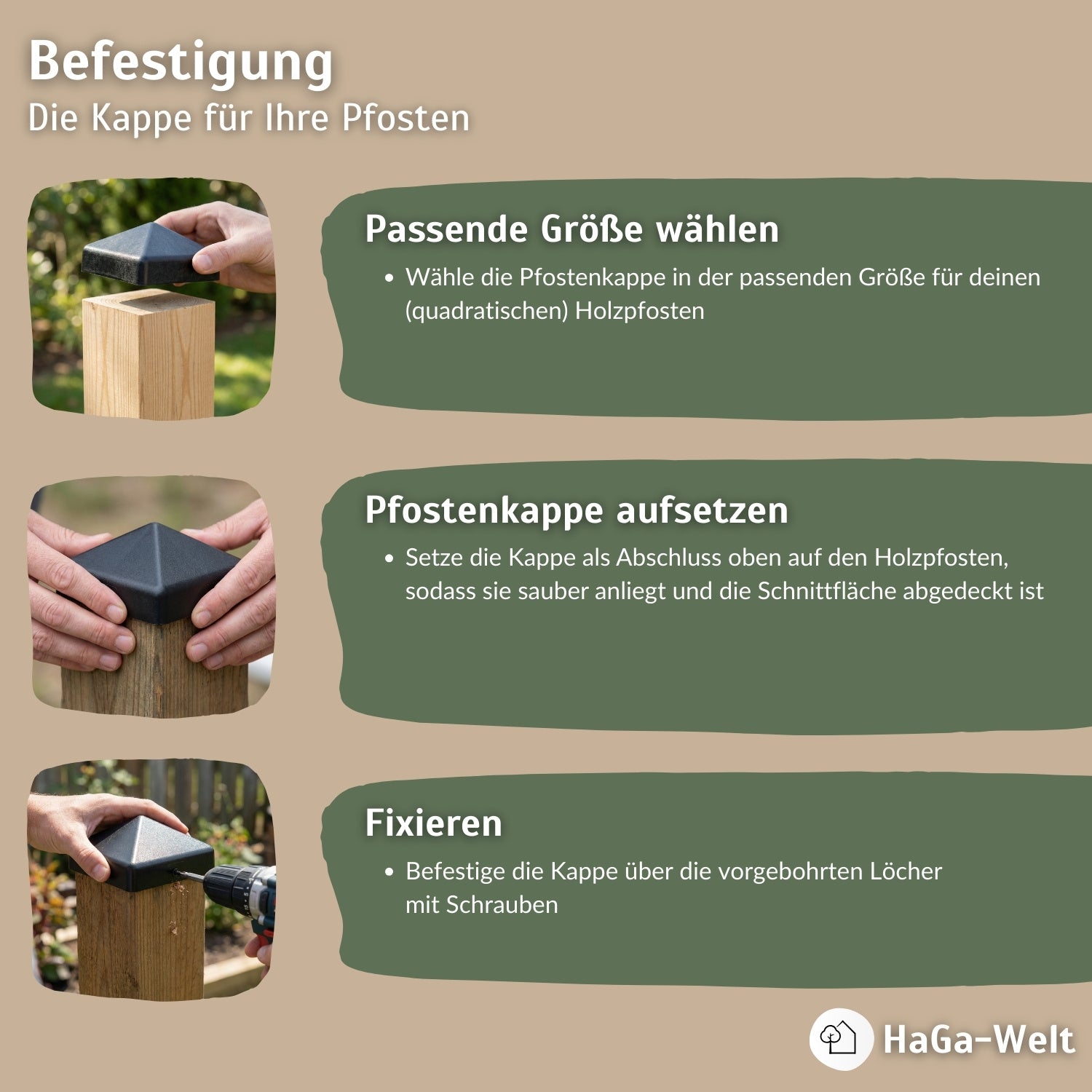 Attaching the post covers is straightforward: Pre-drilled holes allow for quick installation with screws . Alternatively, the caps can also be attached with weatherproof mounting adhesive – depending on your requirements.