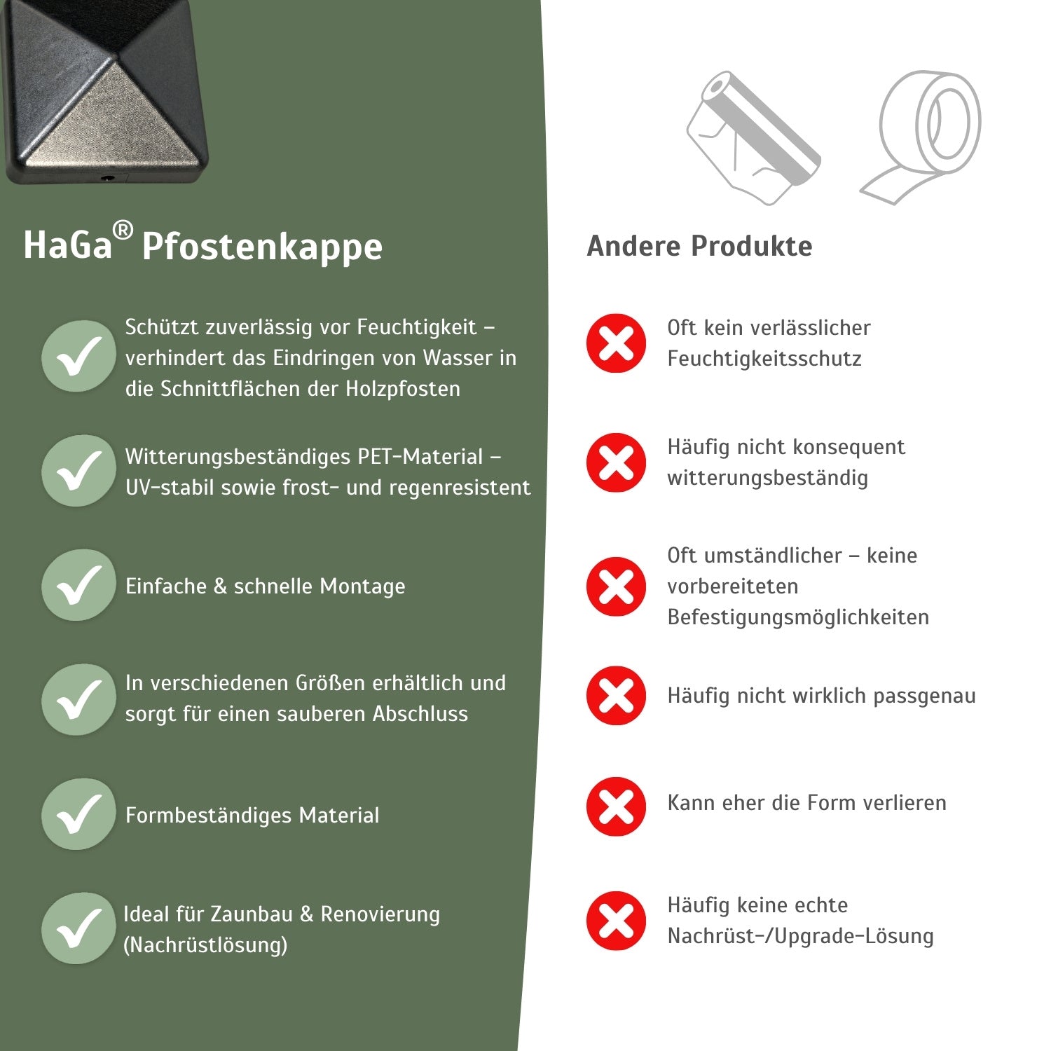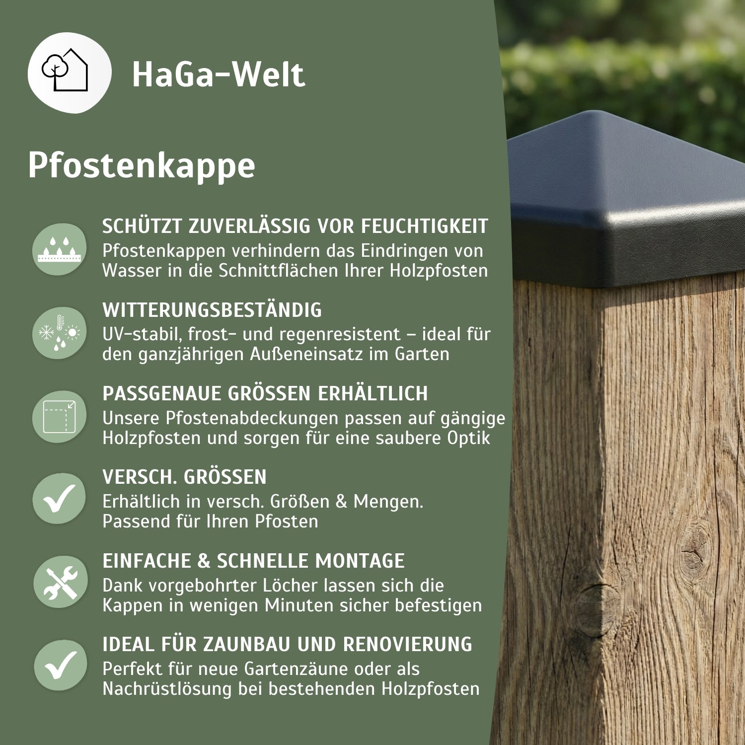 A well-maintained garden fence begins with the details – and ends where wood is most vulnerable: at the exposed surfaces of the posts. This is precisely where our post caps made of robust PET come in. They not only provide a clean finish, but also provide long-term protection for your wooden posts against the effects of moisture, weather, and wear.