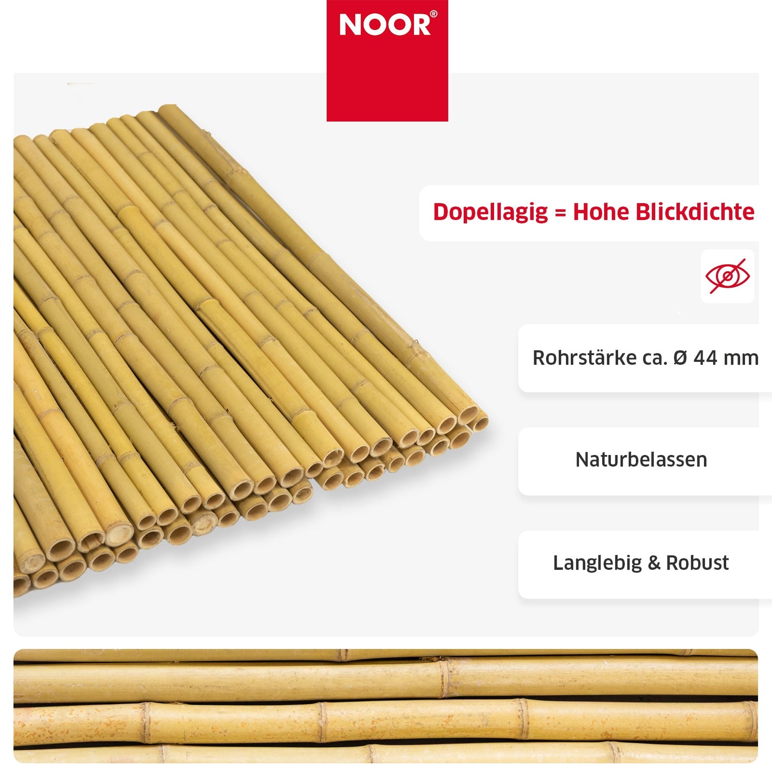 Die Bambusrohre besitzen eine Rohrstärke von bis zu ca. 40 mm und machen die Matte extrem robust und langlebig. Dadurch eignet sie sich nicht nur als Sichtschutz im Außenbereich, sondern auch hervorragend als Raumteiler, Dekowand oder natürlicher Paravent im Innenbereich.