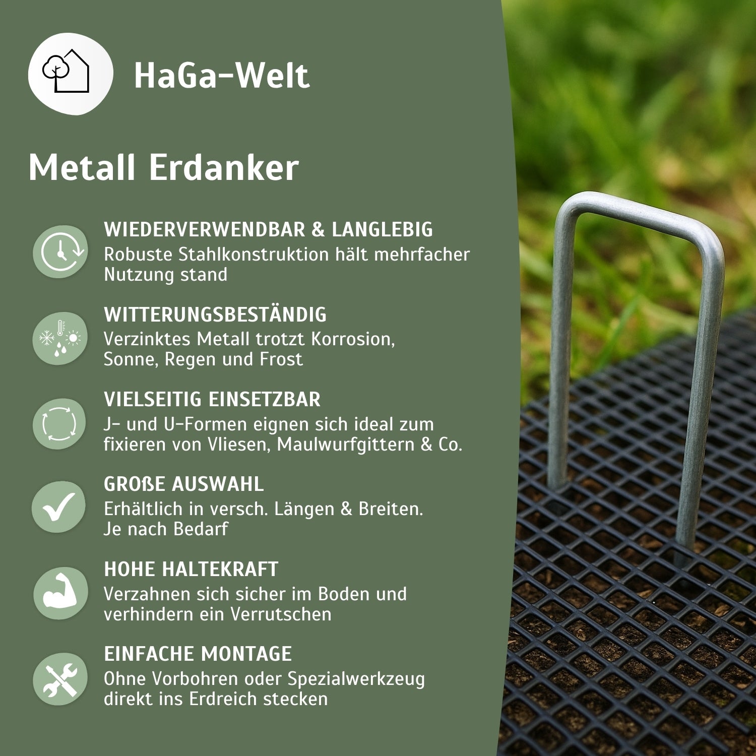 Unsere Erdanker aus Metall eignen sich ideal zur Befestigung von z.B. Rasenschutzgittern, Unkrautvliesen, Maulwurfnetzen, Planen, Zelten und Pavillons. Dank ihrer stabilen Bauweise lassen sich die Bodenanker auch in härteren Böden sicher verankern. Einmal im Boden bieten die Erdanker festen Halt – auch bei Wind und Wetter.