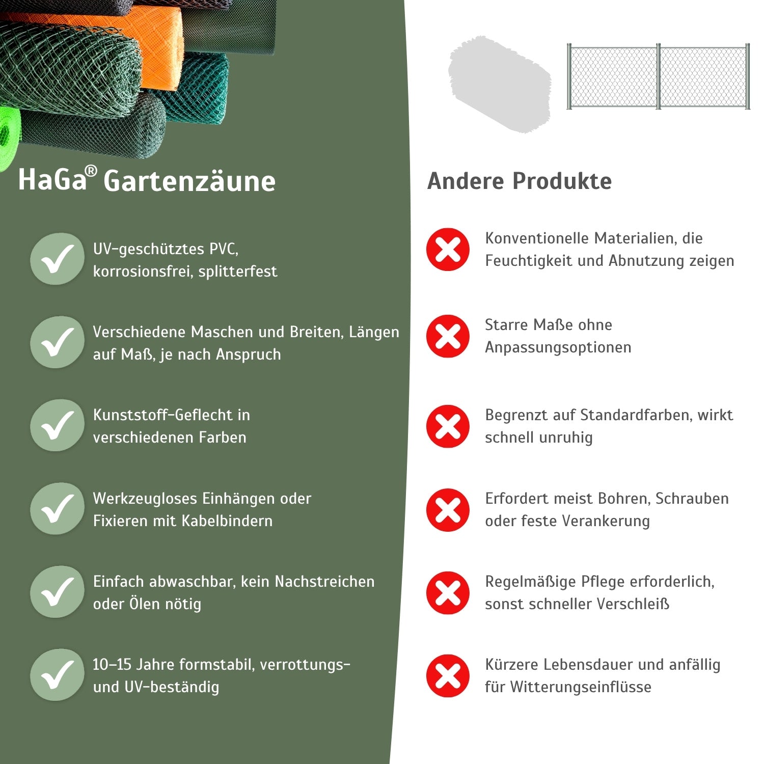 Der Gartenzaun aus hochwertigem Kunststoff hält jeglichen Witterungsbedingungen wie Sonne, Regen, Wind und Frost stand. Abhängig von Material, Höhe und Maschenweite ist der Zaun für viele verschiedene Zaunbau-Projekte geeignet. Der Kunststoffzaun ist ein wahres Leichtgewicht und lässt sich flexibel und mobil verwenden.